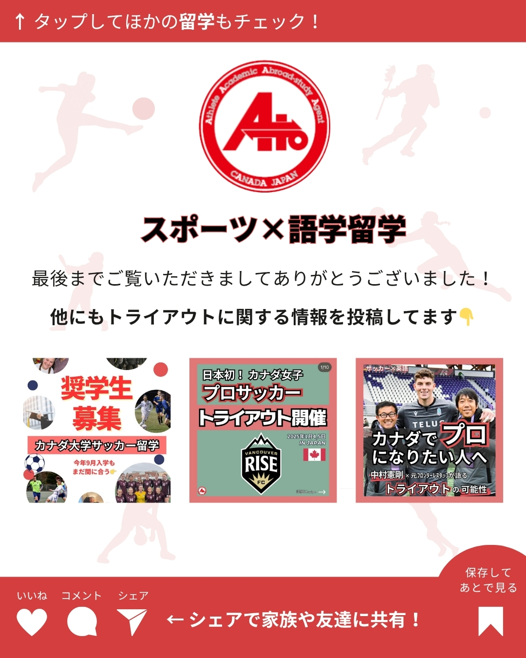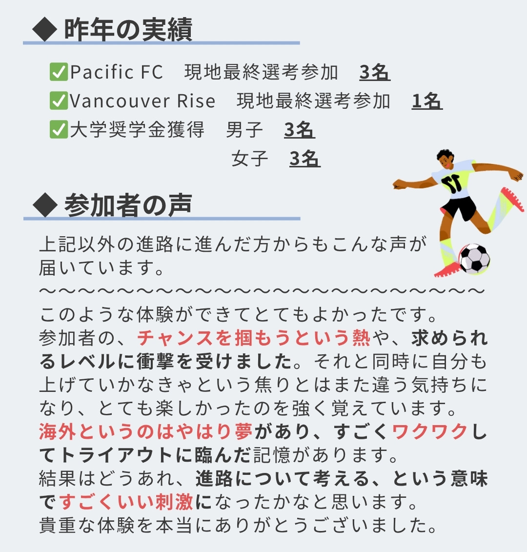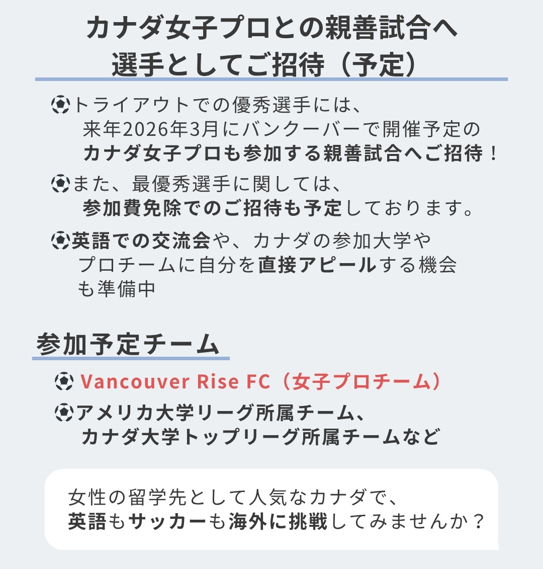 今年もカナダサッカープロ契約(男女)の選考、及びカナダの大学サッカー部奨学生(男女)の選考を合同にて開催いたします。